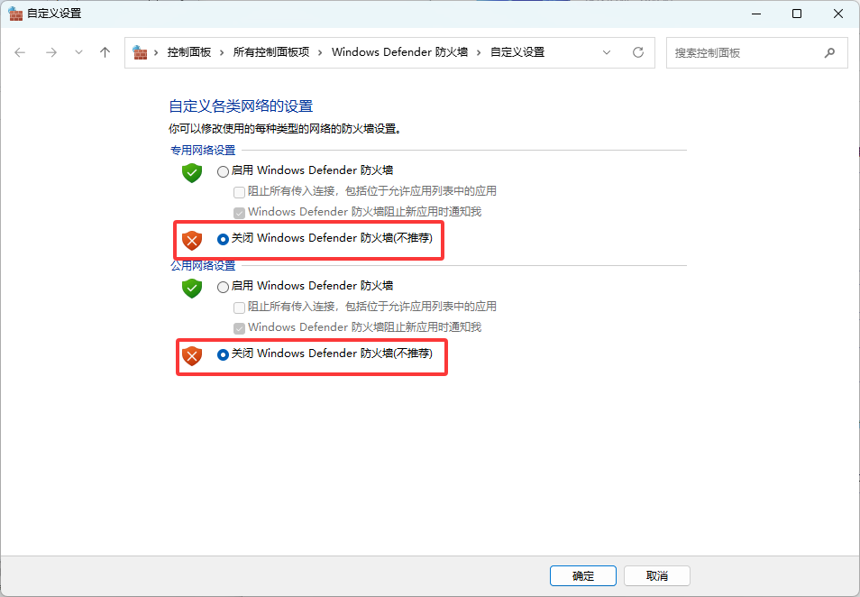 右键开始 → 打开“控制面板” → Windows Defender 防火墙 → 启用或关闭 Windows Defender 防火墙 → 全部选择“关闭”。