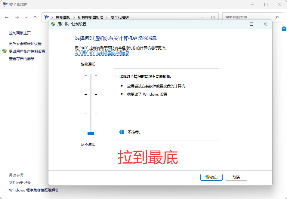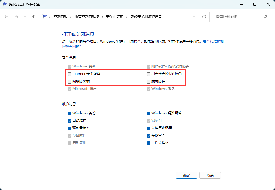 返回控制面板主页 → 安全和维护 → 更改安全和维护设置,取消勾选相关项;更改用户账户控制设置拉到最低。