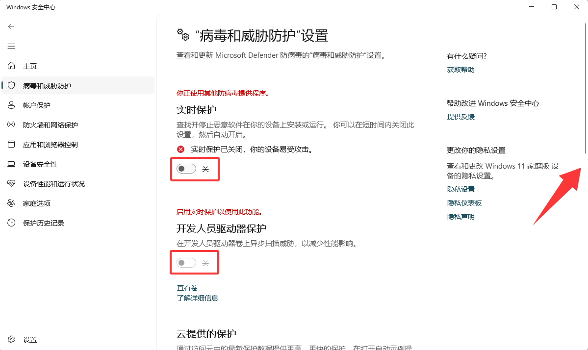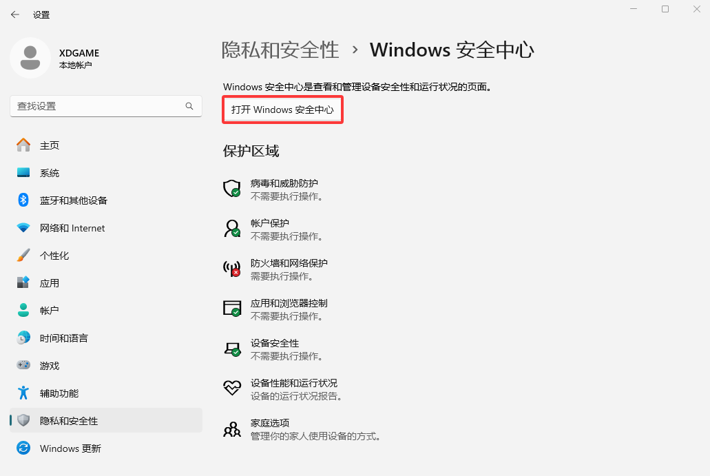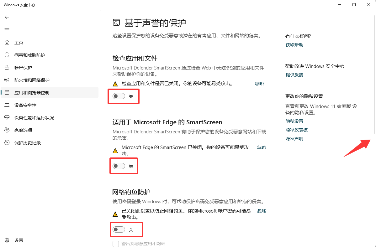 设置 → 隐私和安全性 → Windows 安全中心 → 病毒和威胁防护 → 管理设置,全部关闭;防火墙和网络保护 → 防火墙通知设置 → 管理通知,全部关闭;应用和浏览器控制 → 基于声誉的保护,全部关闭;设备安全性 → 内核隔离详细信息,全部关闭。
