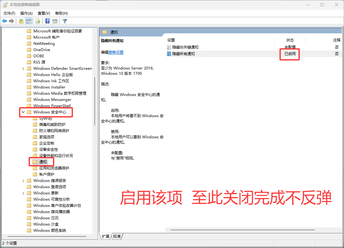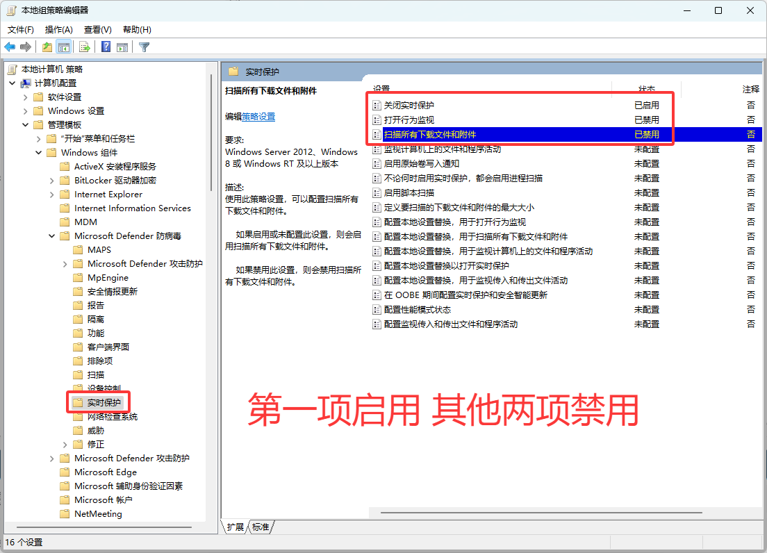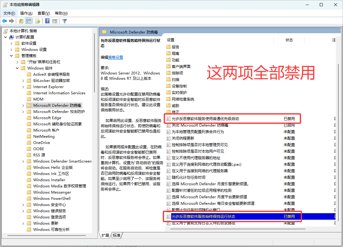 ,依次打开:管理模板 → Windows 组件 → Microsoft Defender 防病毒,禁用“允许反恶意软件服务使用普通优先级启动”和“允许反恶意软件服务始终保持运行状态”;进入“实时保护”项启用“关闭实时保护”,并禁用“打开行为监视”“扫描所有下载文件和附件”;进入 Windows 安全中心 → 通知 项启用“隐藏所有通知”。